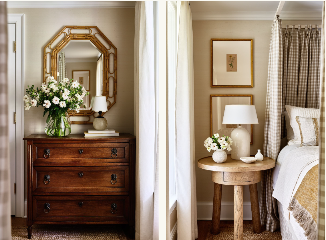 The previous owners had made updates to the primary bathroom, but it lacked style and warmth. I changed out the vanity, lights and mirrors. The plumbing fixtures are from Waterworks, the sconces Urban Electric and the rattan mirrors I found vintage at a local store. I had a collection of antique bird prints framed that I had sourced at the Paris flea. The paint color is Sea Pearl by Benjamin Moore.