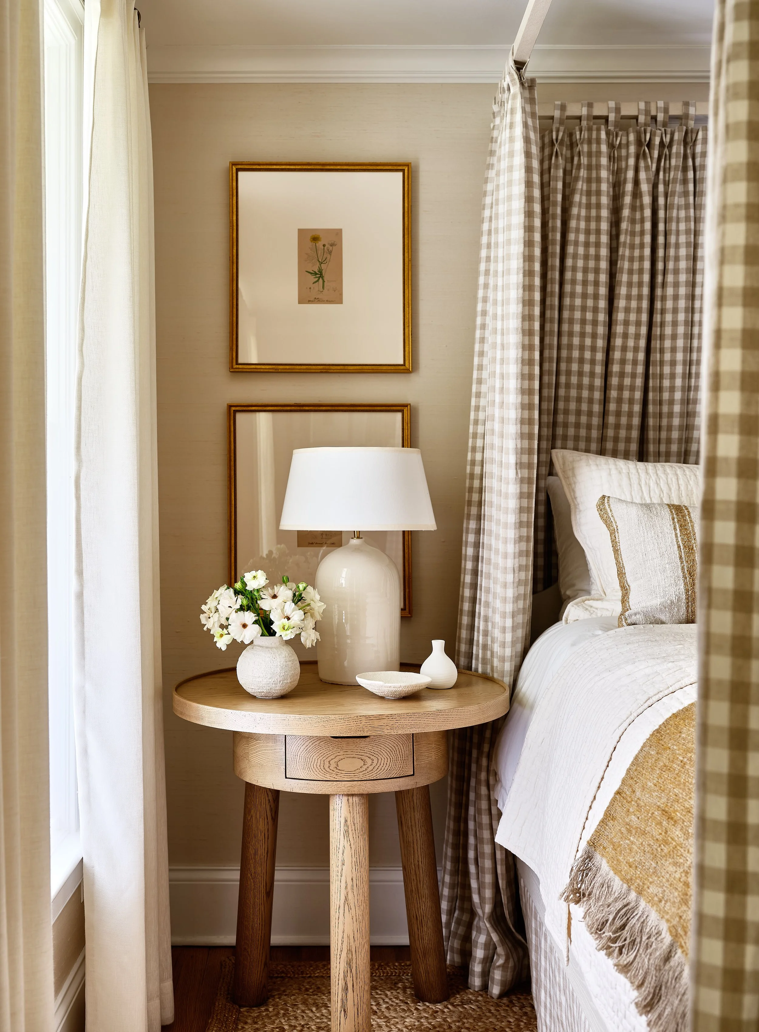 Probably the most comfortable room in the house, the guest room has a slew of my favorite things including a canopy bed, vintage botanical prints, custom oak nightstands, French ceramic lamps from Bungalow, a vintage louis chest, rattan mirror, bench and a cozy jute rug. The bed is from Serena and Lily and the check fabric is from Cowtan and Tout. The walls are covered in a silk wallpaper.