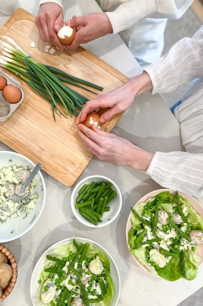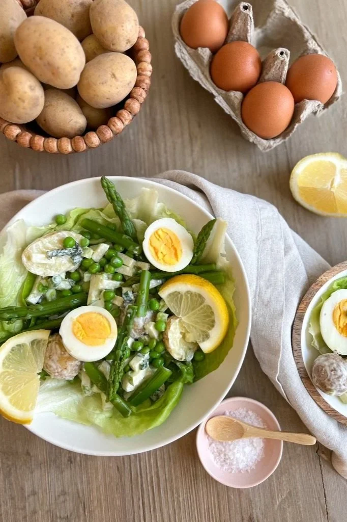 This salad celebrates fresh ingredients that become bountiful in spring. Asparagus and peas, fresh herbs, and crisp gem lettuce inspire a reinvigorated approach to your wellness journey. The jammy-eggs provide satiating protein while the baby new potatoes lightly coated in Primal Kitchen mayonnaise feel ultra-nourishing and delicious!