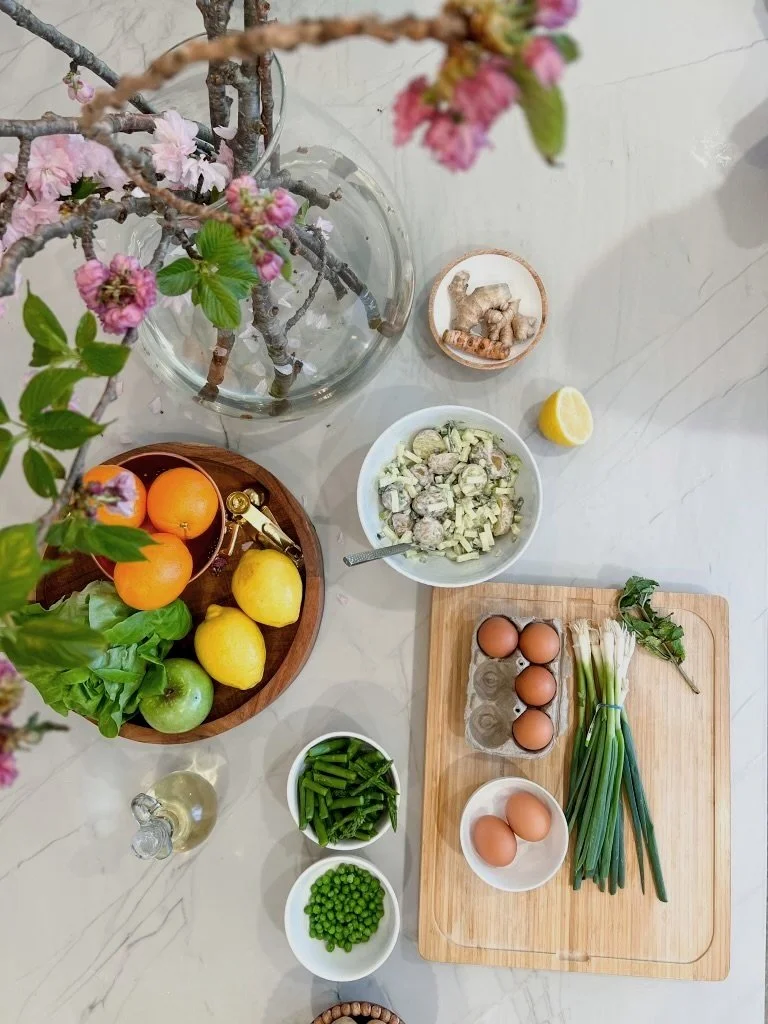 Lauren: I believe strongly in the idea of making mealtime beautiful. As busy women and mothers, balancing children, partners and careers (among a million other things), it can be hard to carve out time for meals, let alone sitting down and creating an enjoyable dining experience. However as challenging it may be, taking time for yourself to sit down to a quiet and calm meal surrounded by beauty is so important for your physical well-being. So many of my clients tell me that they skip meals altogether or shove food down their throats while standing over the sink with 2 kids hanging off of them. When you eat in that sort of scenario, your brain barely has time to register that it consumed nutrients, and you may leave the meal feeling unsatisfied which can lead to uncontrollable snacking and less-than ideal choices later in the day. When you don’t satisfy your physical and emotional hunger in a real way you will end up binging on junk food later when the kids are asleep and you finally have a minute to yourself. To combat this, I suggest building even just 10-15 minutes of time into your morning and afternoon for a peaceful breakfast and lunch. It’s non-negotiable and it’s built into your calendar. If that means you have to wait until the children are at school or napping in the morning to have a real meal, that’s what it means! You could wake up with water, coffee/tea and a piece of fruit, and hold-off on a proper breakfast until you have the time to make it special. This could mean finding a placemat that brings you joy, buying beautiful dinnerware and serve ware, designating a certain coffee mug just for you or placing a single floral stem in a small vase to place on your table during the meal. Bring a sense of meaning, beauty and ritual to your meals and see how it changes your health journey!